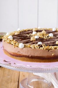 Una volta che la Cheesecake senza cottura alla Nocciolata si è rappresa, toglierla dallo stampo e decorarla con altra nocciolata e granella di nocciole